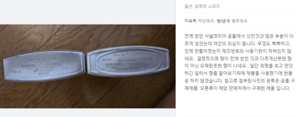 또 다른 구매 고객도 샤넬코리아에서 판매한 향수 제품과 이곳에서 구매한 제품 사진과 글을 공유하며 “전에 사용했던 샤넬코리아 공식 홈페이지에서 구매했던 것과 많은 부분이 다르게 생겼는데 약간의 의심이 든다”라고 말했다.