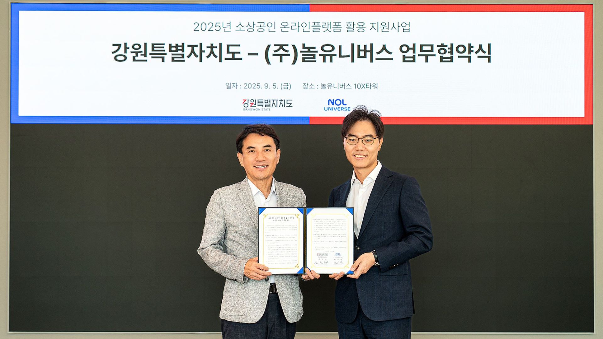 놀유니버스는 지난 5일 판교 신사옥 10X타워(텐엑스타워)에서 강원특별자치도와 ‘소상공인 온라인 플랫폼 활용지원을 위한 업무협약’을 체결했다고 7일 밝혔다.