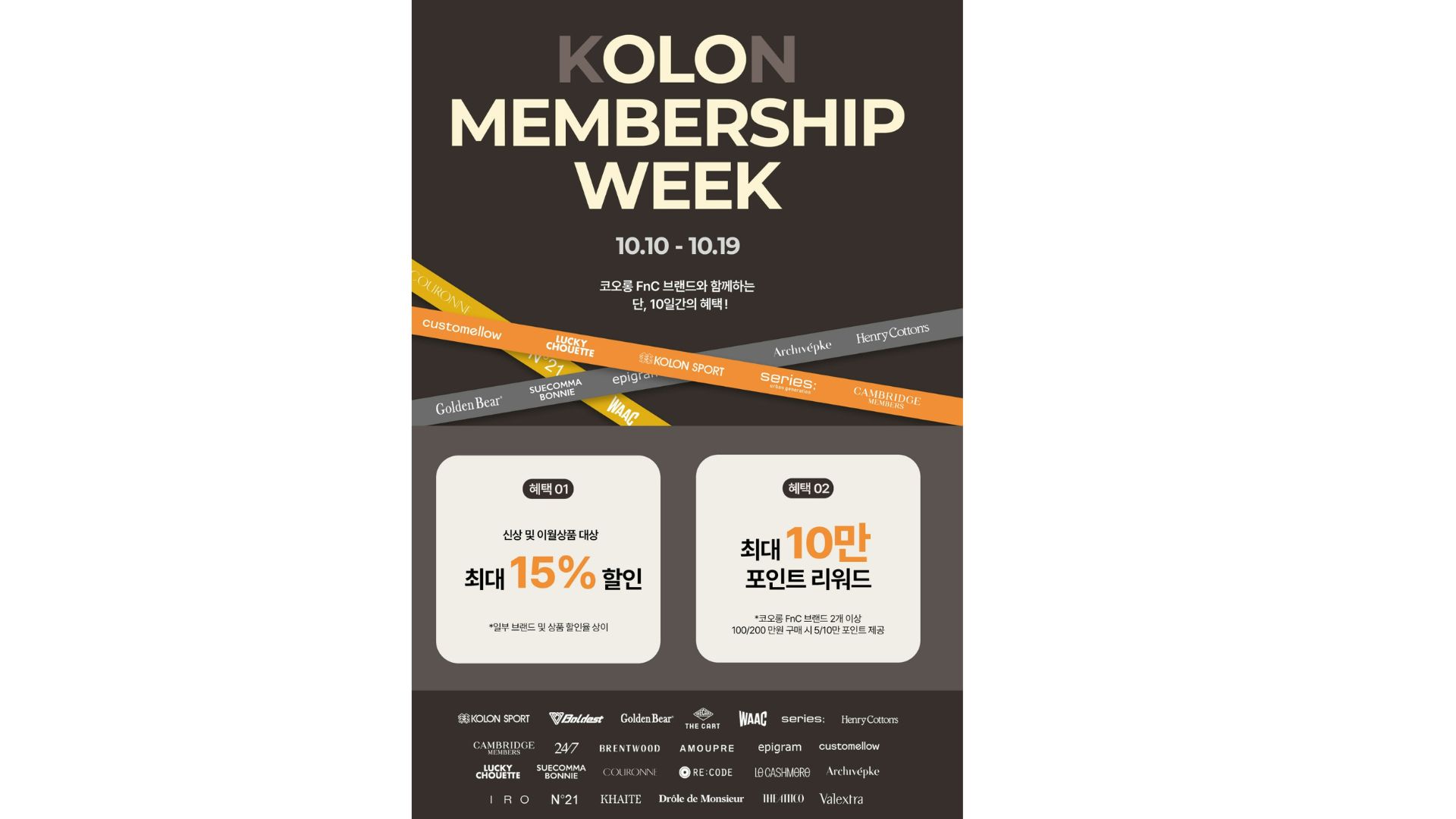 코오롱FnC 관계자는 “코오롱FnC의 다양한 브랜드가 함께 참여하는 이번 행사를 통해 고객에게 실질적인 혜택을 제공하고, 브랜드 간 교차 구매를 활성화해 멤버십 충성도를 높일 계획”이라며 “나아가 단순한 할인 혜택을 넘어 고객이 쇼핑 여정에서 즐거움과 만족을 느낄 수 있는 경험을 제공함으로써, 멤버십 고객만의 특별한 가치를 지속적으로 만들어 나가겠다”고 전했다.
