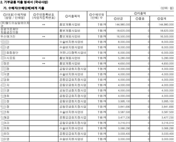 2024년 기부금품 지출 명세서는 아직 비공개 상태다.