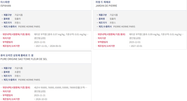 또한 피에르 에르메 초콜릿 제품에서는 세균수가 기준을 초과해 수입이 금지됐다. 대상 제품은 ‘퓨어 오리진 상토메 플뢰르 드 셀’이다.