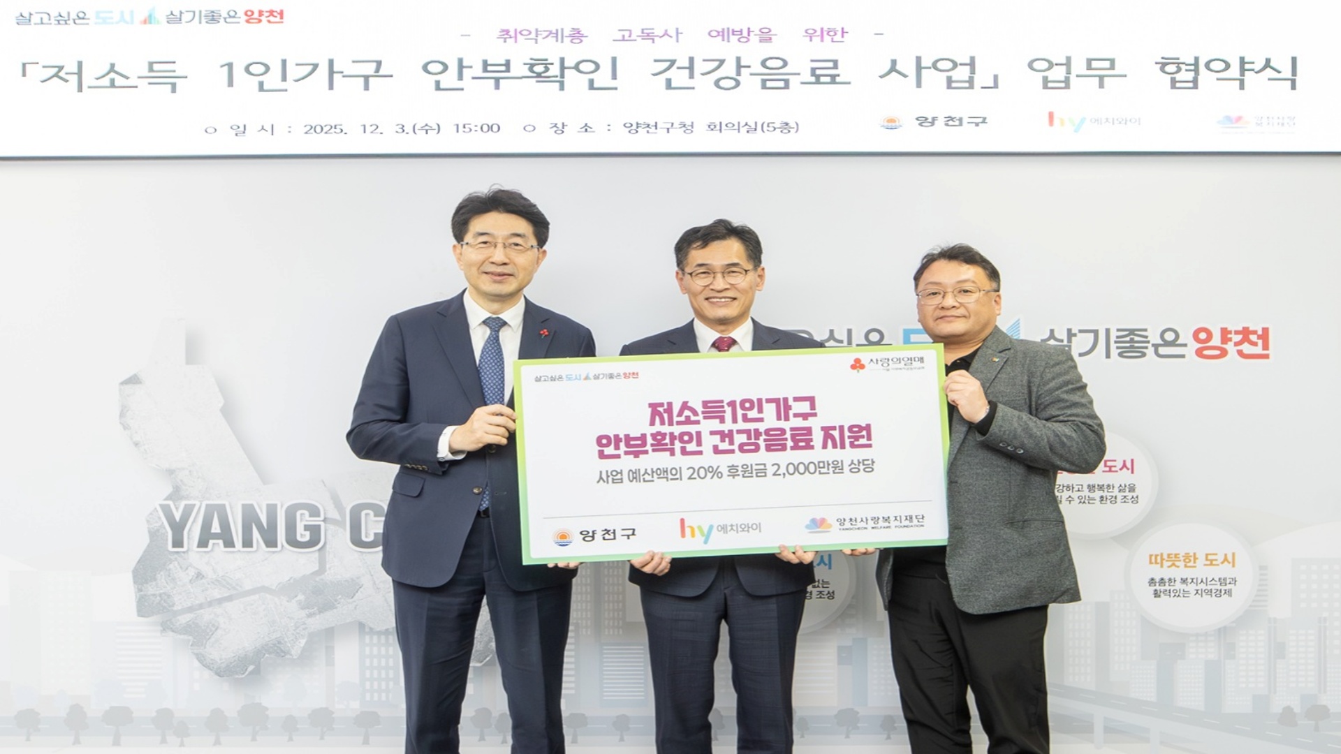 hy는 양천구, 양천사랑복지재단과 ‘저소득 1인 가구 안부확인 건강음료 사업’ 업무협약(MOU)을 체결했다고 4일 밝혔다.