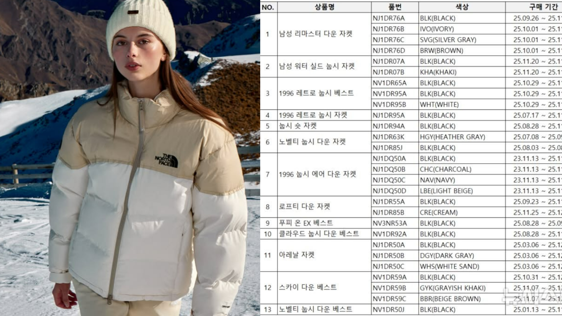 이번에 확인한 충전재 혼용률 오기재 제품은 ▲남성 리마스터 다운 자켓 ▲남성 워터 실드 눕시자켓 ▲1996 레트로 눕시 베스트 ▲1996 레트로 눕시자켓 ▲눕시숏자켓 ▲노벨티눕시 다운자켓 ▲1996 눕시 에어 다운 자켓 ▲로프티 다운 자켓 ▲푸피 온 EX 베스트 ▲클라우드 눕시 다운 베스트 ▲아레날 자켓 ▲스카이 다운 베스트 ▲노벨티눕시 다운 베스트 등 13개 폼목이다.